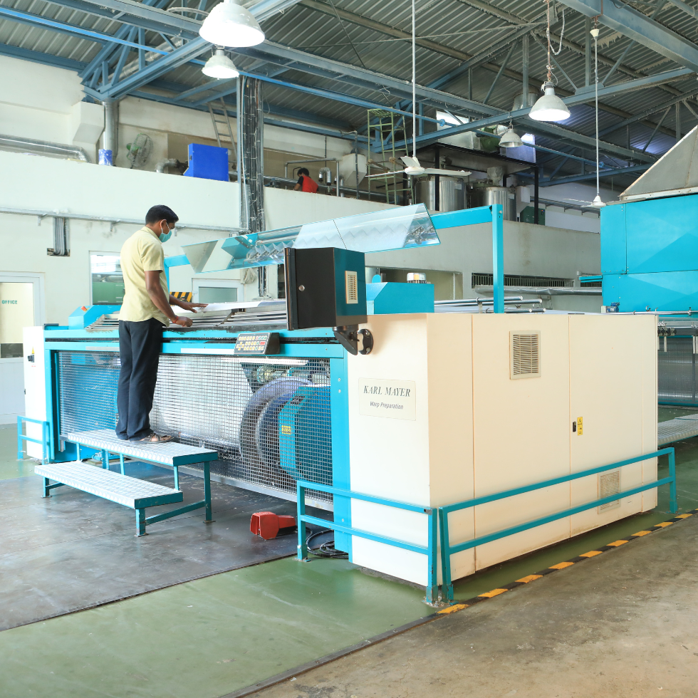 Our Karl Mayer warping machines are engineered for high-performance warp beam production, ensuring uniform yarn arrangements. Operating at speeds up to 1,200 m/min, these machines provide precise yarn alignment, enabling superior fabric quality during weaving.